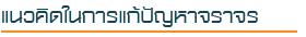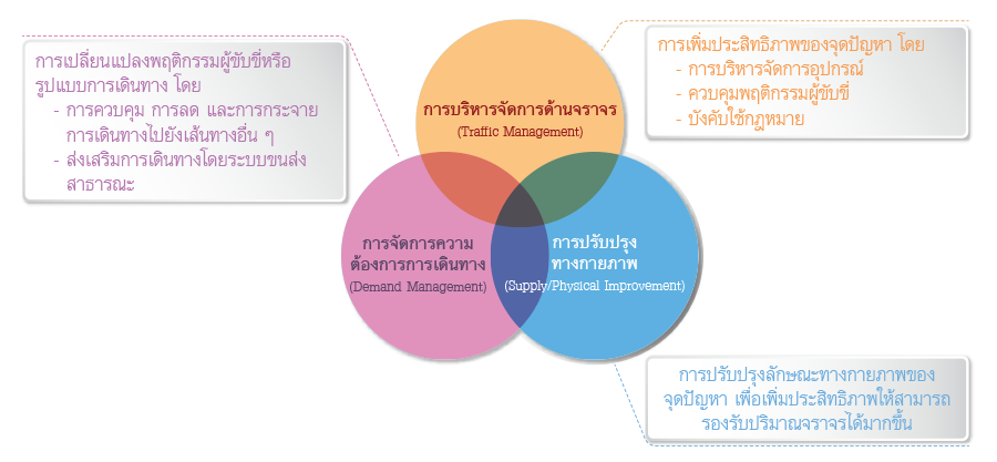 แบ่งแนวคิดการแก้ปัญหาจราจร ออกเป็น 3 แนวทาง เพื่อให้สามารถรองรับการพัฒนาพื้นที่ในอนาคต และผลกระทบจากการ เปลี่ยนแปลงต่อคนในพื้นที่ต้องเป็นที่ยอมรับ ครอบคลุม 3 องค์ประกอบด้านจราจร คือ ผู้ขับขี่ ยานพาหนะ และถนน ดังนี้