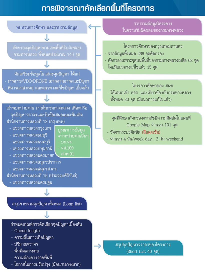 การวิเคราะห์และกำหนดขอบเขตปัญหาจะต้องพิจารณาหาสาเหตุจากการตรวจสอบโครงข่าย ข้อมูลการร้องเรียน รวมถึง ข้อมูลจากหน่วยงานในพื้นที่ และการคัดกรองปัญหาด้านการจราจรจากดัชนีติดขัดของฐานข้อมูลสารสนเทศ (Google Traffif x Live) พร้อมกับการลงพื้นที่สังเกตการบริเวณพื้นที่ศึกษา เป็นต้น