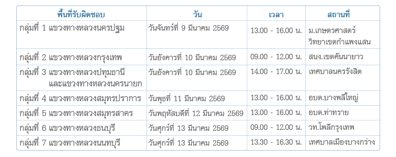 จำนวน 7 เวที (พื้นที่ กรุงเทพฯ (2)/นนทบุรี/ปทุมธานี/สมุทรปราการ/สมุทรสาคร/นครปฐม) |